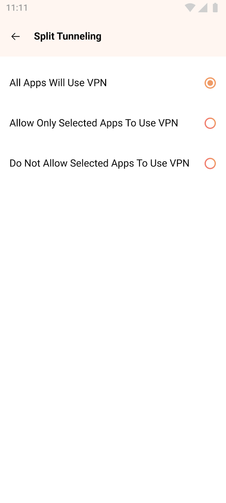 • Tap split tunneling. By default, split tunneling is set to all apps that will use VPN.