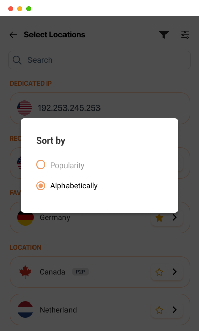 - Click the Sorting icon from the top right to sort locations by names or popularity. You will now see the options to sort them.