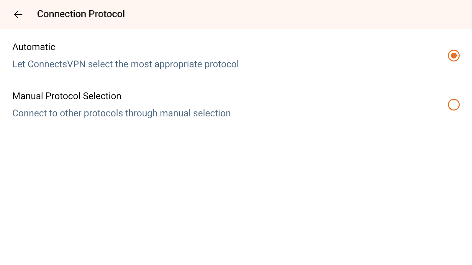 The VPN protocol type significantly impacts the performance and stability of your connection. Make sure to select the correct protocol when connecting to a VPN server. ConnectsVPN recommends the automatic protocol as it will select the most appropriate connection setting for you. However, if the Automatic protocol option does not work for you, feel free to switch between different protocols.