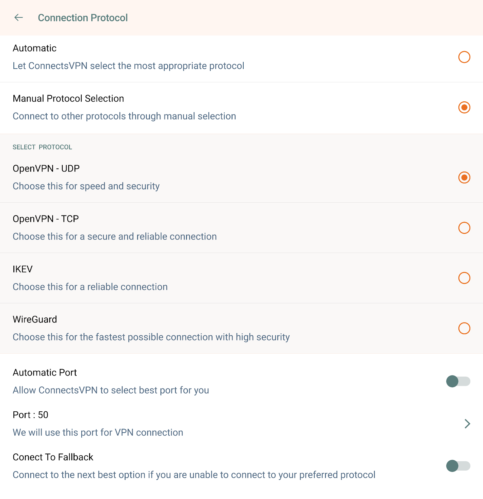 To switch between protocols in the ConnectsVPN app, you must first disconnect. You can view the VPN protocol by disabling the “Automatic Protocol Selection” option.