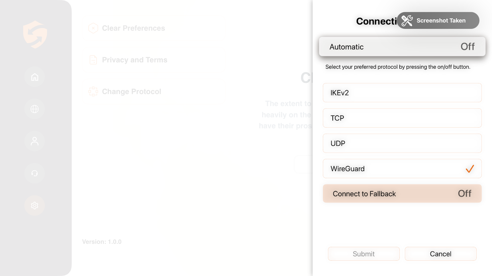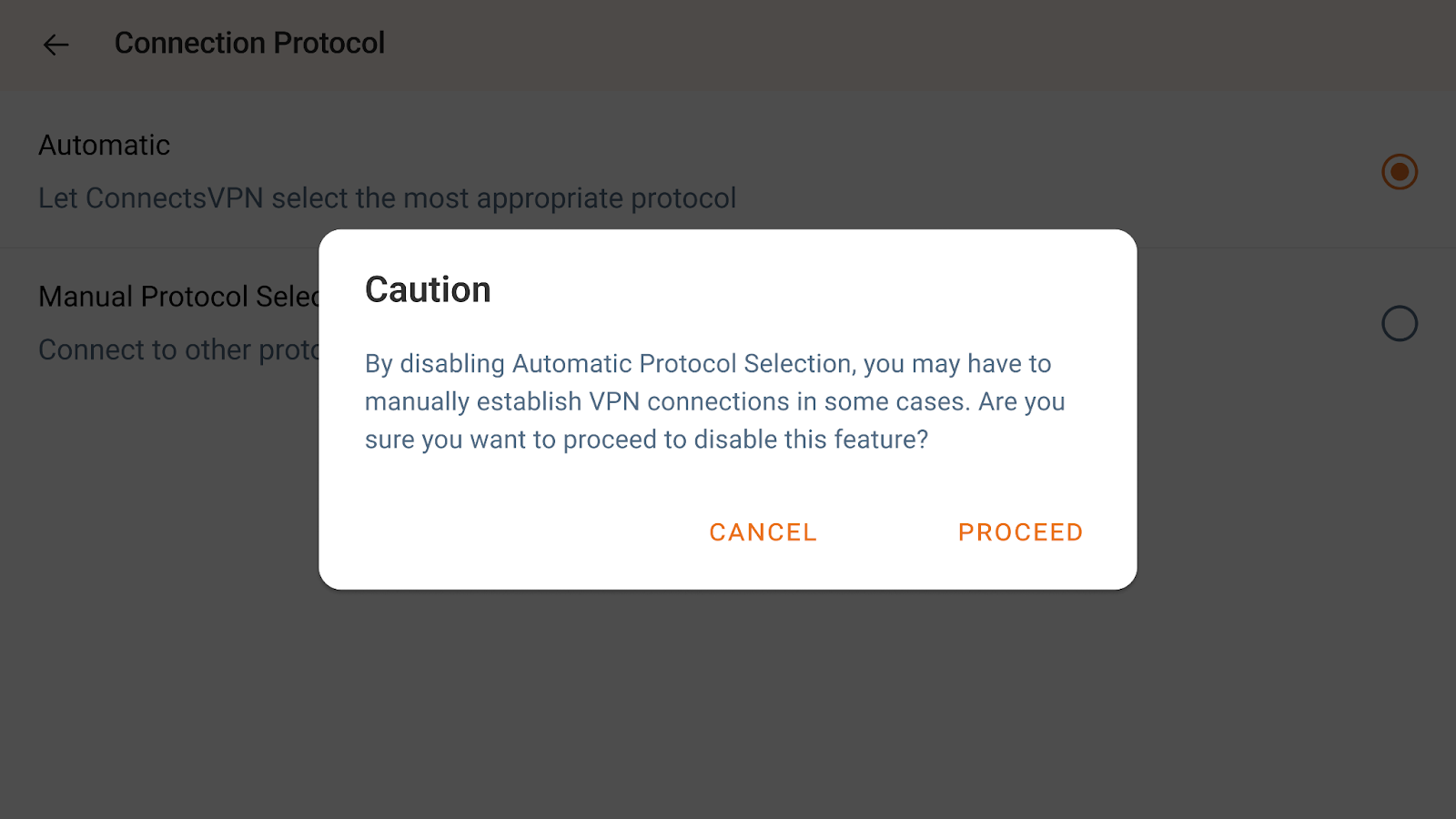 To switch between protocols in the ConnectsVPN app, you must first disconnect. You can view the VPN protocol by disabling the “Automatic Protocol Selection” option.