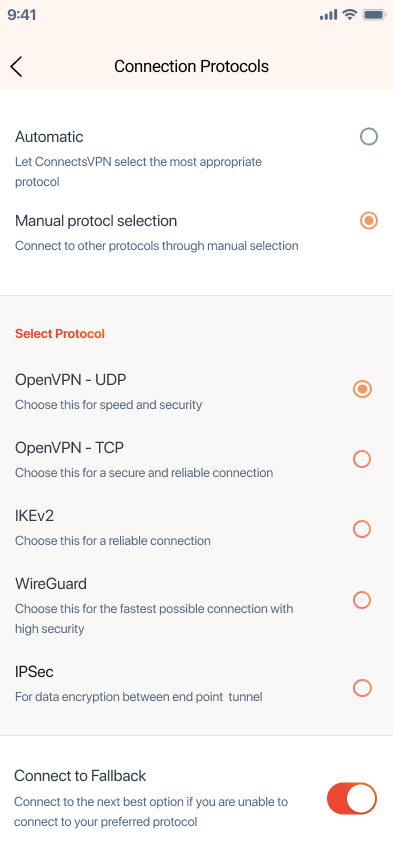 Before switching between protocols in the ConnectsVPN app, make sure to disconnect first. You can view and modify the VPN protocol by turning off the “Automatic Protocol Selection” option.