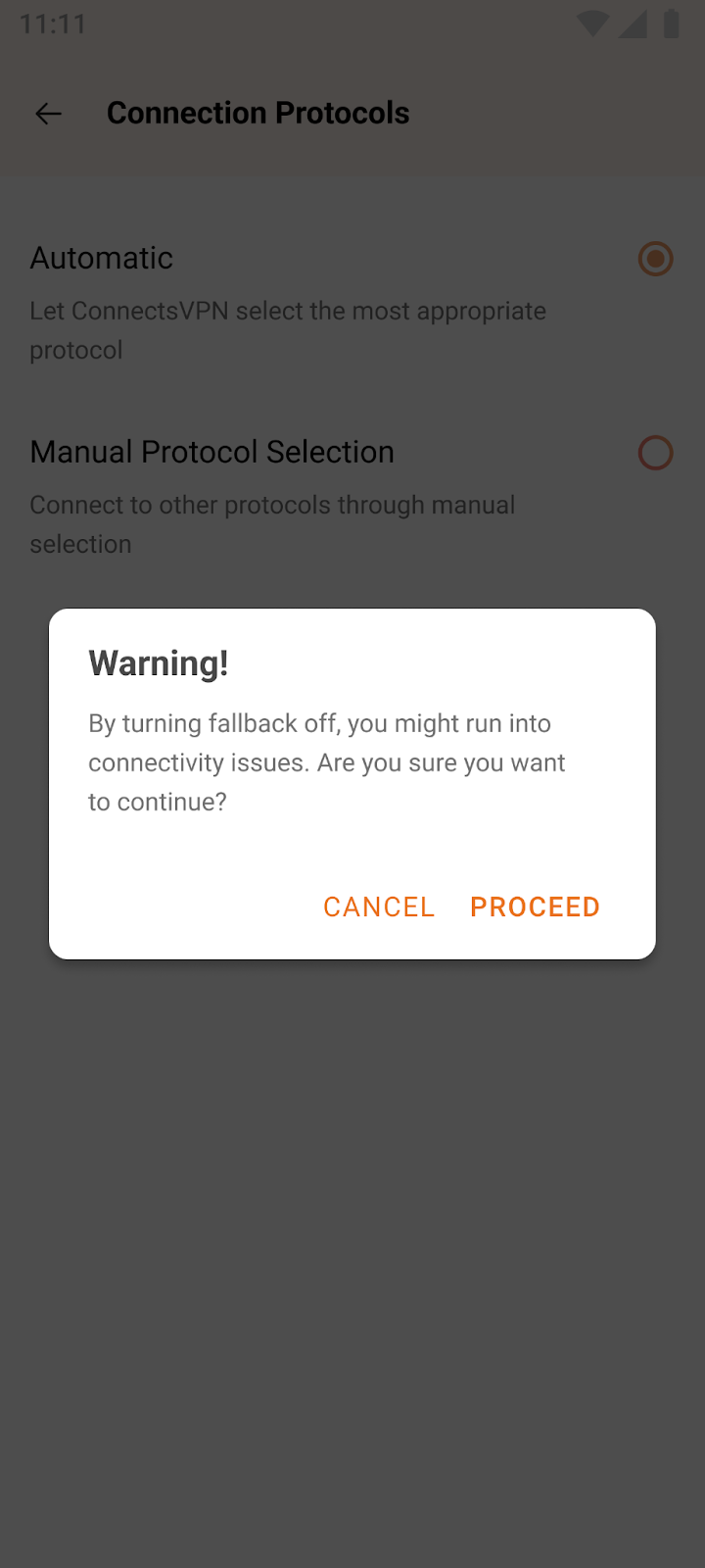 - Change your protocol selection; A warning will appear, and tap Proceed to continue.