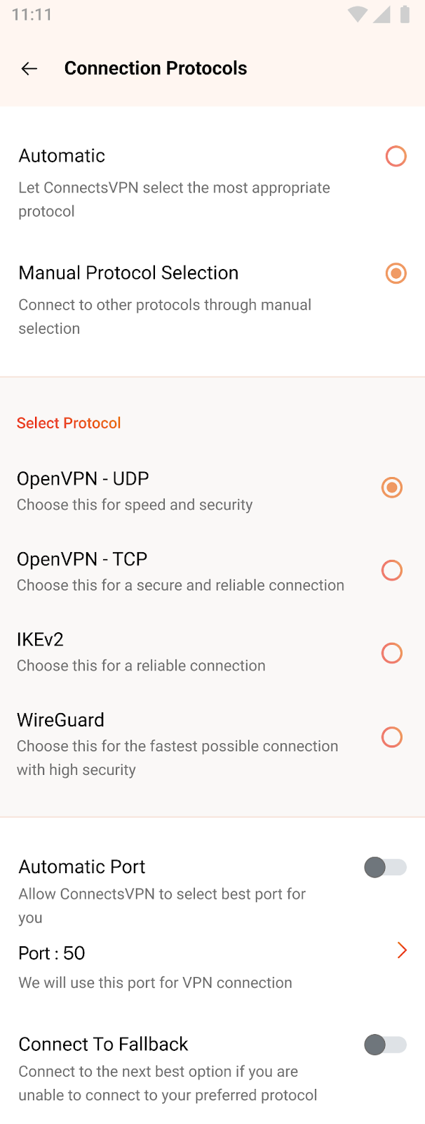 Before switching between protocols in the ConnectsVPN app, it’s crucial to disconnect first. You can review and modify the VPN protocol by turning off the “Automatic Protocol Selection” option.
