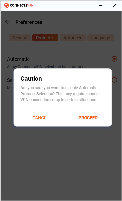 Prior to changing protocols within the ConnectsVPN VPN app, ensure you disconnect first. You can modify and switch the VPN protocol by disabling the “Automatic Protocol Selection” option.