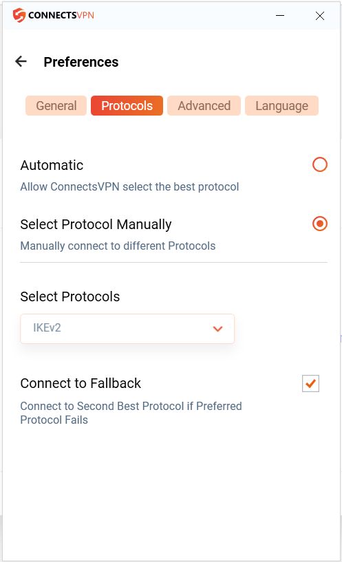 Connect to Fallback: This option will connect you to the next best available option if you cannot connect with your preferred protocol.
