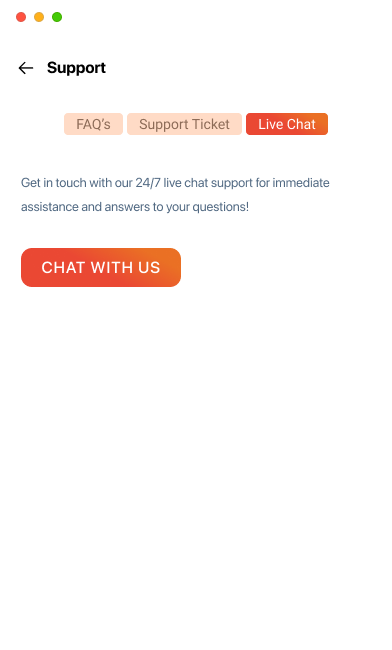 Contact our support team effortlessly through the app and open a support ticket. Our 24/7 support heroes will reach out to you instantly. Wondering how to do it? Follow the instructions below: