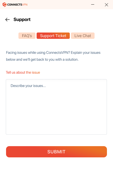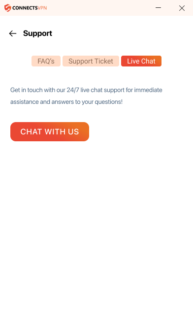 To contact our support team and open a support ticket, simply access the ConnectsVPN app and follow the instructions below. Our dedicated 24/7 support heroes will promptly assist you with any queries or concerns you may have.