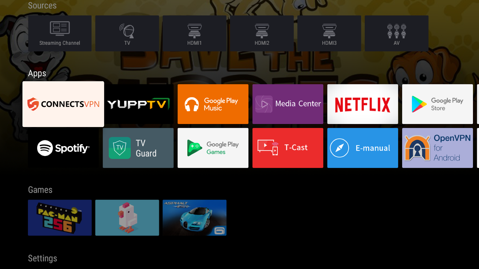 - From your Android TV main menu, launch the Google Play Store and search for ConnectsVPN.